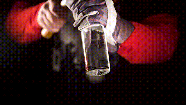 在高速摄影机下,我们可以清晰地观察拍击的一瞬间到底发生了什么。这里,我们拿一个装了水玻璃瓶,然后击打瓶口,用来模拟拍罐头的场景。