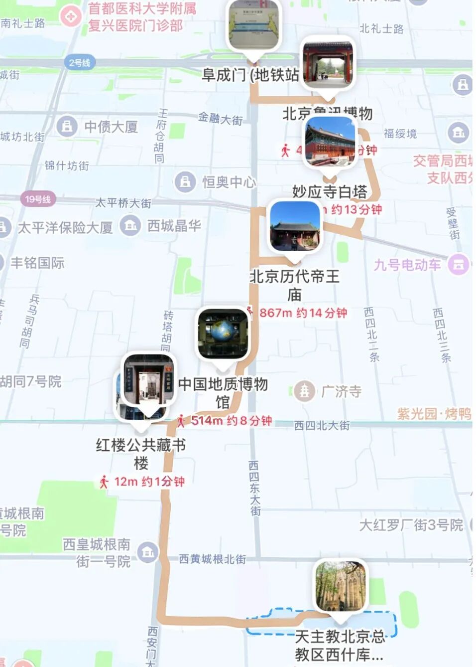 这条线路从阜成门到西四全程1.7公里,聚集了包括鲁迅博物馆、白塔寺东西岔、历代帝王庙、地质博物馆、红楼藏书楼、正阳书局、砖塔胡同等著名文化景点和白塔寺药店耀咖啡、北京护国寺小吃、必胜客Pizzeria等精品美食打卡点,既承载着阜成门“京西古道”东端点(“煤门”历史底蕴)的老城记忆,又处于被老舍先生称之为“北京最美大街”的阜朝大街(阜成门到朝阳门)西段,更加展现了西城区白塔寺片区城市更新风貌,串联起文学古建、皇家礼制、科普书香、非遗美食等多种业态场景。鲁迅博物馆、红楼藏书楼、正阳书局浸润着“书香京城”的浓墨书香,鲁迅书屋咖啡、耀咖啡等精品小店弥漫着咖啡清香,必胜客Pizzeria那不勒斯窑炉披萨和沿线北京小吃荟萃着国际美食之都的味蕾香,漫步北京这条微旅行线路,体验“四香”(花香、书香、咖啡香、美食香)慢生活。