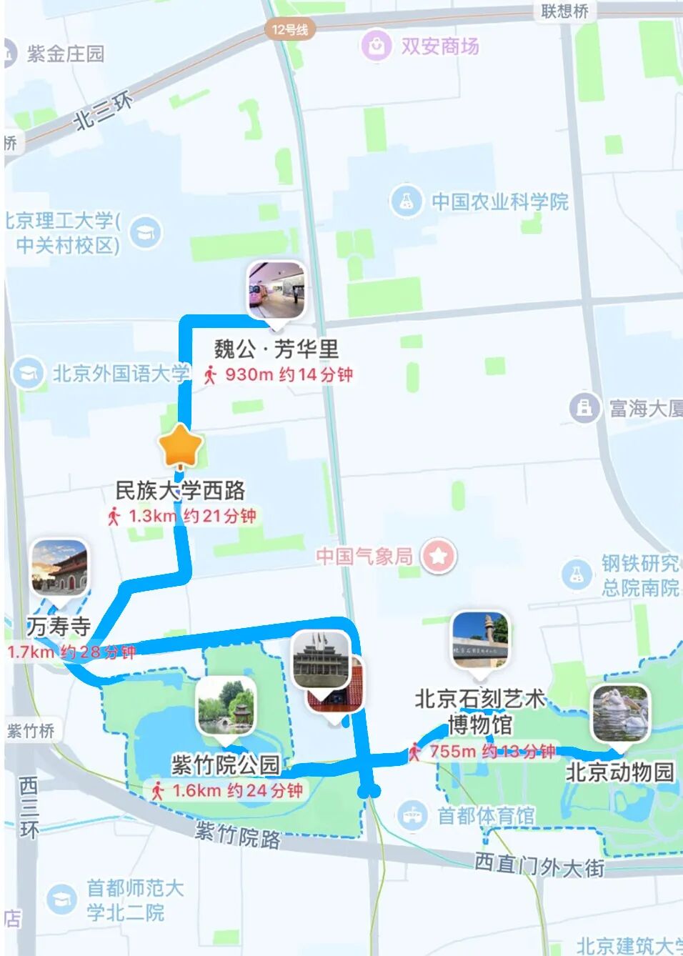 “漫步北京·蓝润四海”<海淀区>Colorwalk线路行程:北京动物园—五塔寺(北京石刻艺术博物馆)—紫竹院公园—中国国家图书馆—国家典籍博物馆—万寿寺—民族大学西路—魏公·芳华里