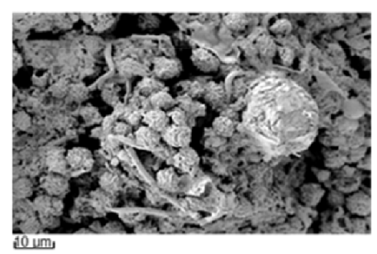 那些纤维变形了。原本直径15到25微米的醋酸纤维素纤维,现在完全卷曲、折叠,彼此紧紧压实在一起,形成了一个个规则的球形结构。每个球体的直径大约6微米。它们的表面覆盖着一层碳酸钙,钙离子来自土壤之中。在元素分析中,这些球体呈现出有机物与矿物质交织的信号,碳、氧、钙的分布彼此重叠。
