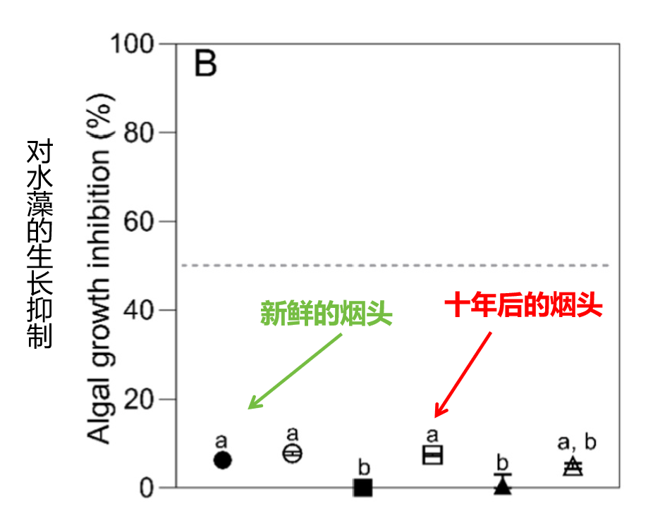经过时间洗礼的部分烟头,对水藻的生长抑制作用却更高一点点|参考文献1